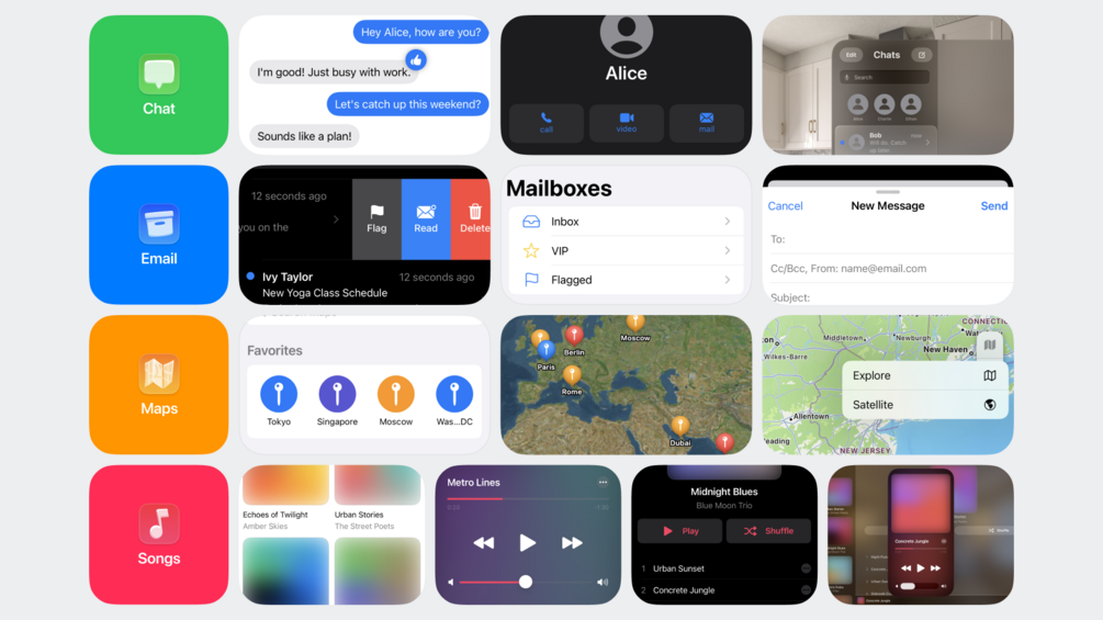 Includes four SwiftUI apps: Chat, Email, Maps, and Songs